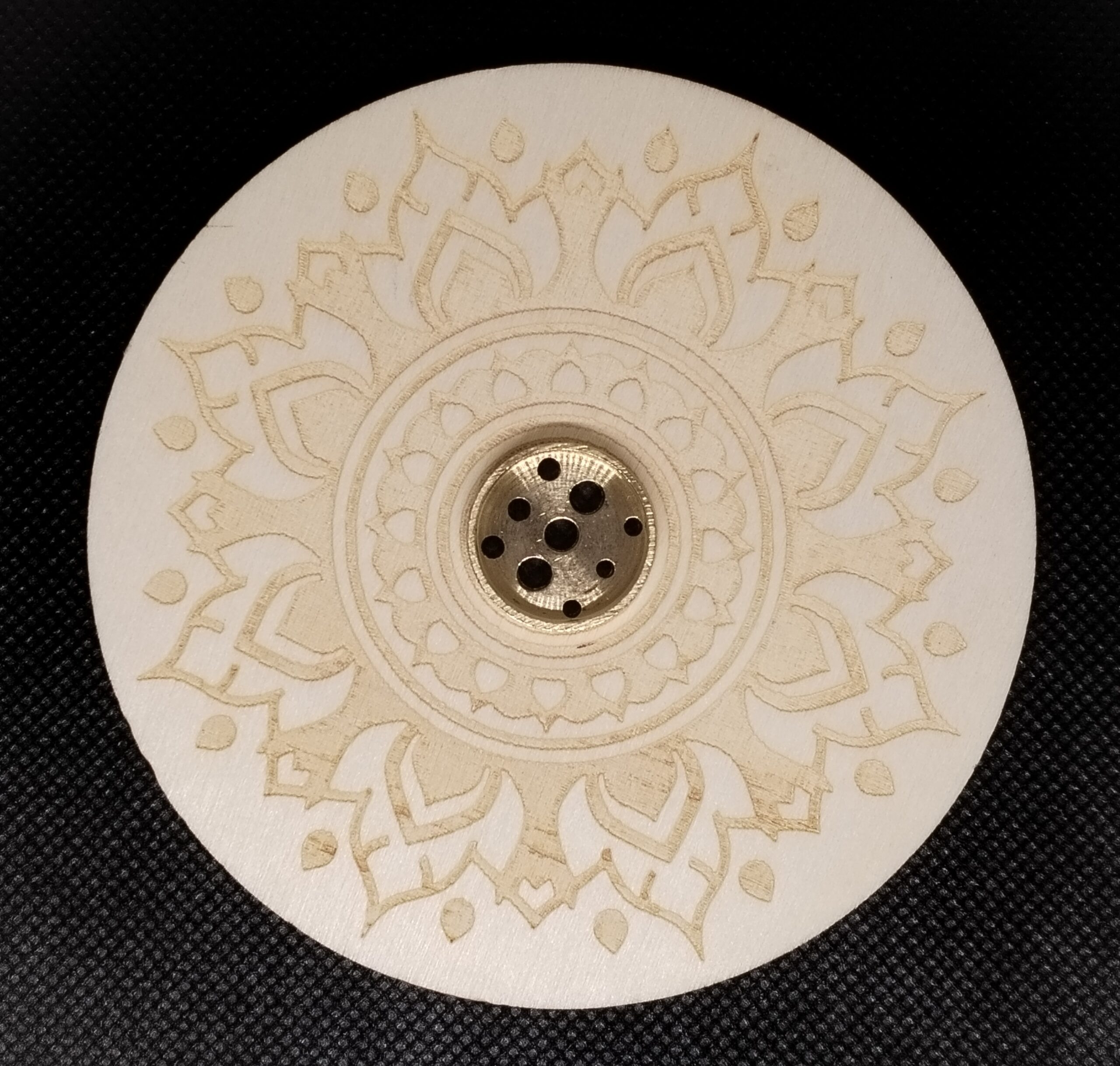Dieser kunstvoll gestaltete Räucherstäbchenhalter aus Holz vereint Funktionalität und Ästhetik in einem einzigartigen Mandala-Design in Holzfarbe. Die Mitte ziert ein goldfarbener 9-Loch-Metalleinsatz für 3 unterschiedliche Stäbchengrößen, der Platz für mehrere Räucherstäbchen gleichzeitig bietet – ideal für Meditation, Zeremonien oder einfach zum Entspannen.